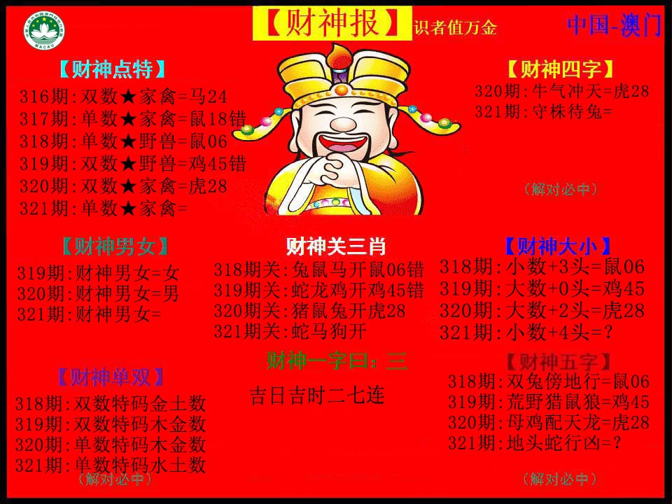 | 321期必中二肖:鼠马 | 321期必中③码:06.42.12 |